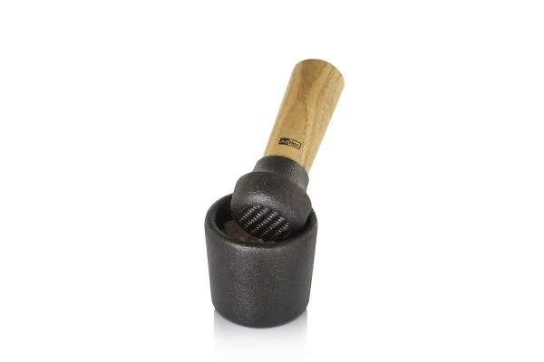 Mit seinem edlen und zeitlosen Design ist er ein echter Hingucker in jeder Küche. Der Griff des Stößels ist aus hochwertigem Akazienholz und liegt dadurch besonders gut in der Hand, während die gusseisernen Reibflächen robust und kraftvoll ideale Mahl- und Reibergebnisse erzielen. Die Konture des Mörsers und die Geometrie des Stößels sind perfekt aufeinander abgestimmt. Die handliche Größe ist ideal zur Verwendung am Tisch. Die rutschfesten Gummifüße für ein sicheres Arbeiten und geschützte Arbeitsflächen.