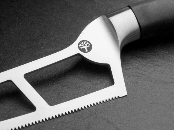 Der geschmiedete Kropf bietet jederzeit einen sicheren Griff und schützt bei einem Abrutschen vor möglichen Verletzungen. Als besonderes Design-Feature ist der Klingenrücken bei allen Messern dieser Serie sanft abgerundet. So liegt das Messer in jeder Griffposition angenehm in der Hand und verhindert auch bei stärkerem Druck auf den Klingenrücken im Wiegeschnitt ein unangenehmes Druckgefühl in der Hand.