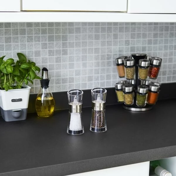 Das Set aus der Inverta Serie von Cole&Mason. Das Besondere bei den Inverta Mühlen ist, dass sich das Mahlwerk im Kopf der Mühle befindet. Zum Mahlen von Salz und Pfeffer muss die Mühle daher über Kopf gedreht werden, somit gibt es keine Reste auf Tisch und Arbeitsplatte mehr. Besonders schickes Acryl-Design mit hochwertigem Edelstahlband. Volle Geschmacksentfaltung durch die hochwertige Mahlwerke und ein sauberer Tisch machen diese Mühle zu einem Muss für jede Küche. Mit rostfreiem Karbonstahlmahlwerk für Pfeffer und Keramikmahlwerk für Salz.