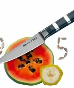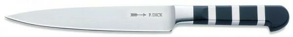 Dick Messerserie 1905 verbindet klassisches Design mit modernster Technologie, höchstem Hygieneniveau sowie exzellenter Qualität und Funktionalität. Die ebenmäßigen Stahlringe werden durch ein einzigartiges Verfahren untrennbar mit dem Kunststoff verbunden. Alle Messer der Serie Dick 1905 sind optimal ausbalanciert und verjüngen sich zur Spitze. Die Klingen werden aus dem von Spitzenköchen bevorzugten deutschen Edelstahl XCrMoVMn gefertigt und schlank angeschliffen. Durch ein hochtechnologisches Härteverfahren bei Temperaturen von ca. 1060° C und einer Tieftemperaturbehandlung von bis zu -190° C wird eine Härte über 60 HRc erzielt. Gezieltes Anlassen in mehreren Schritten bei ca. 200° C ermöglicht eine einzigartige, dynamische und scharfe Schneide der Dick Messer 1905. Die Härte wird dabei schonend auf 55 HRc gebracht. Dieser besondere Härtegrad gewährleistet einerseits die Schärfe und Schnitthaltigkeit, lässt andererseits aber noch das einfache Nachschärfen zu.