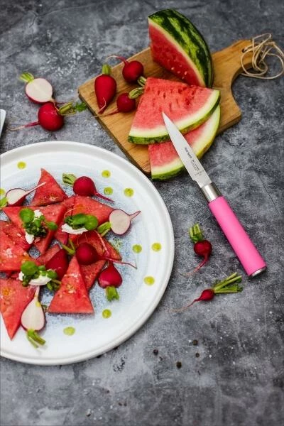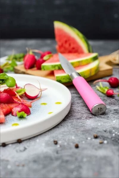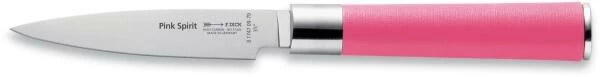 Dick Officemesser aus der Serie Pink Spirit. Das kleine, wendige Messer mit elastischer Klinge ermöglicht präzises Arbeiten aus dem Handgelenk. Besonders geeignet zum Schälen, Zerkleinern und Verzieren von Zwiebeln, Knoblauch oder Kräutern.