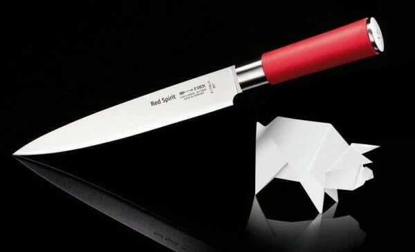 Dick die inspirierende Messerserie Red Spirit. Die Messerserie Red Spirit ist kompromisslos auf Schärfe ausgelegt. Die Klingen von Red Spirit werden extrem schlank ausgeschliffen. Zusätzlich wird die Schneide poliert. Red Spirit Messer sind einfach zu führen und erzeugen einen exakten und sauberen Schnitt. Das Schneidgut wird weder gequetscht noch gebrochen, so dass wertvolle Aromastoffe in den Lebensmitteln erhalten bleiben.