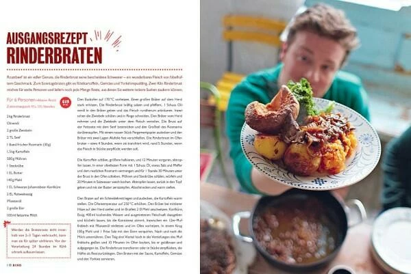 Seine Philosophie, in der Küche nichts wegzuwerfen, sondern alles zu verwerten, bestimmt auch die Reihenfolge der Kochideen. Auf ein üppiges Hauptgericht wie Rinderbraten folgen mehrere Rezeptvorschläge zur Verwertung der Reste, sollte etwas übrig geblieben sein. Von Gemüse über Huhn und Rind bis hin zu Schwein, Lamm und Fisch gliedern sich die Rezepte nach den Hauptzutaten und versprechen abwechslungsreichen Genuss. Genaue, ausführliche Nährwertangaben zu jedem Gericht bieten Orientierung für eine bewusste Ernährung. Neben gewohnt leckeren Rezepten gibt es von Jamie Oliver aber auch zahlreiche Tipps und Tricks rund um das Thema gute Haushaltsführung, die dabei helfen, bewusster einzukaufen und weniger wegzuwerfen. So zeigt er, was sich mit Gemüseresten, übrigen Chilis oder Weinresten in der Flasche noch alles (köstliches!) anstellen lässt, und verrät, nach welchen Rinderstücken man seinen Metzger fragen sollte. Die wunderbaren Gerichte hat wie immer Star-Fotograf David Loftus in Szene gesetzt und die Bilder machen richtig Lust, gleich loszukochen.