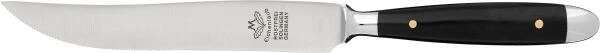 Steakmesser Tafelgröße aus Ebenholz. Unverkennbar mit der zum Klingenrücken zeigenden Spitze. Stabil und mit scharfer Säge versehen ist das Eichenlaub Steakmesser prädestiniert für Fleischgerichte aller Art.