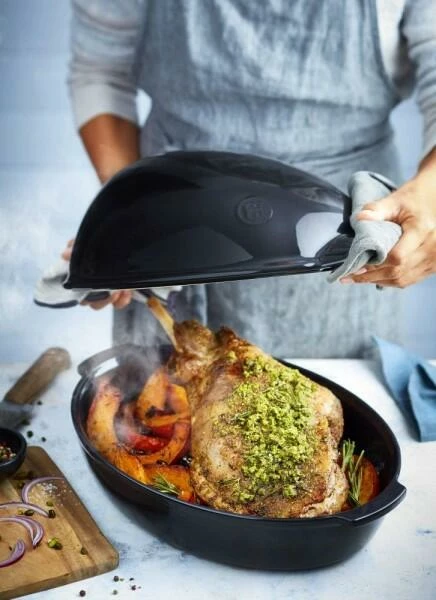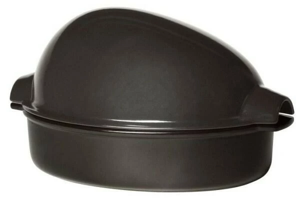 Emile Henry Hähnchenbräter XL in fusain. Zartes Fleisch, knusprige Haut, perfekt gegartes Gemüse und einen sauberen Ofen – das alles bringt der Hähnchenbräter aus Keramik.