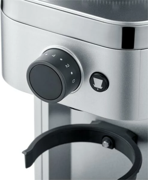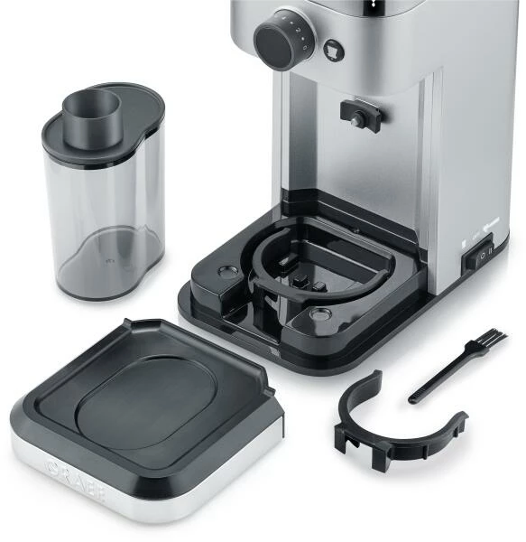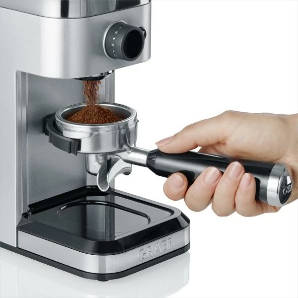 Die Kaffeemühle CM 500 von GRAEF besitzt ein Edelstahl-Kegelmahlwerk. Das Kegelmahlwerk hat den Vorteil, durch geringe Drehzahlen keine oder wenig Hitze zu erzeugen, dadurch ist das Mahlen aromaschonender. Der auf 140 Stufen einstellbare Mahlgrad bildet die Grundlage für den individuellen Kaffeegenuss. Es kann direkt in den Siebträger, den Kaffeefilter oder den Kaffeemehlbehälter gemahlen werden. Dank der ’Grind on Demand’-Funktion, also die automatischen Mahlfunktion für Siebträger, stimmen Sie die Kaffeemehlmenge ganz individuell auf Ihre Bedürfnisse ab. Sie halten den Siebträger einfach so lange an den Kontaktschalter bis er voll ist. Es gibt nichts über frisch gemahlene Kaffeebohnen mit vollstem Aroma.