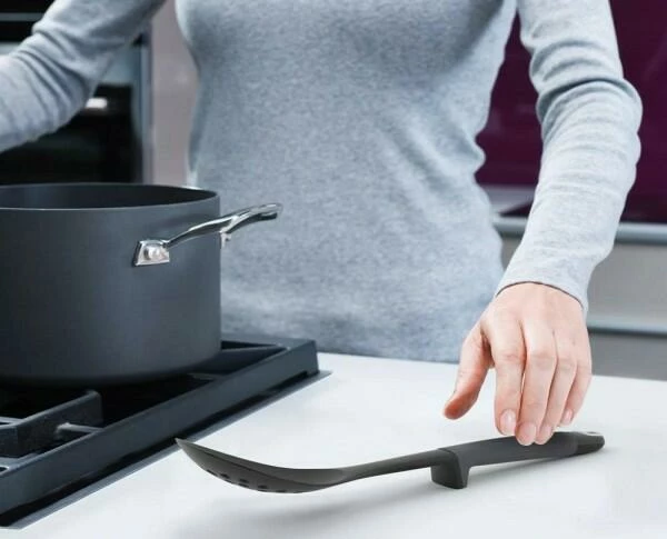 Das Küchenutensilien-Set Elevate Karussell wurde speziell dafür entworfen die Küchenhygiene zu verbessern und den Schmutz, der beim Ablegen von Utensilien auf der Arbeitsfläche entsteht, zu minimieren. Das Set bestehend aus Küchenhelferkarussell, Schaumlöffel, Schöpflöffel, Servierlöffel, Pfannenwender, biegsamer Pfannenwender und Zange verfügt jeweils über einen innovativen beschwerten bunten Griff mit integrierter Auflage, wodurch die Köpfe der Elevate Küchenhelfer niemals direkt auf der Arbeitsfläche aufliegen. Zusätzlich sind die Griffe aus hitzebeständigen Silikon. Die Nylonspitzen der einzelnen Küchenhelfer sind perfekt für die Verwendung mit antihaftbeschichtetem Kochgeschirr geeignet und hitzebeständig bis 270 °C. Der rotierende Standfuß des Küchenhelferkarussells ist rutschfest und ist damit perfekt zum Aufstellen auf der Arbeitsfläche geeignet.