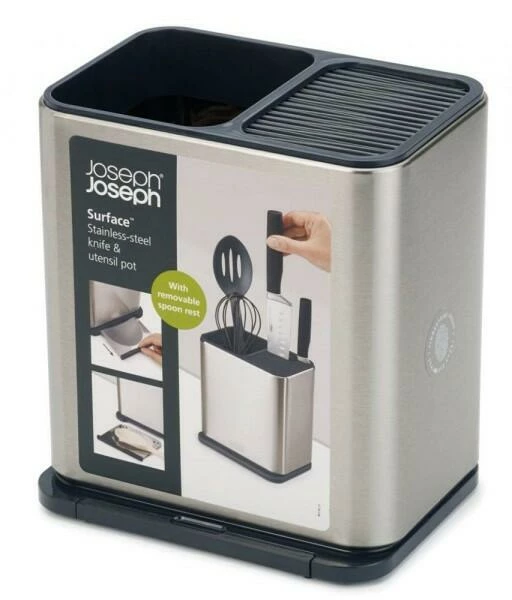 Noch nie war es so einfach Messer und Küchenutensilien zusammen aufzubewahren: Der praktische Messer- und Küchenutensilienbehälter Surface von Joseph Joseph verfügt über ein Hauptfach, welches in zwei Bereiche aufgeteilt ist. Ein Bereich bietet ausreichend Platz für die Aufbewahrung unterschiedlicher Küchenhelfer mit langem Griff. Der andere Bereich verfügt über zahlreiche Schlitze, die ideal zum Verstauen von scharfen Messern geeignet sind. Am unteren Ende des Behälters befindet sich zusätzlich noch eine herausnehmbare Löffelablage, was den Surface von Joseph Joseph zu einem ausgesprochenen praktischen Produkt für die Küche macht.