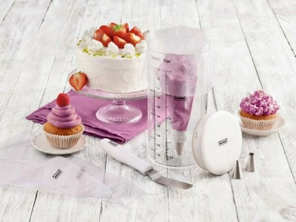 - Set bestehend aus: 1x Messbecher, 1x Winkelpalette, 3x Tüllen, 1x Adapter 2-teilig, 24x Einweg-Spritzbeuteln