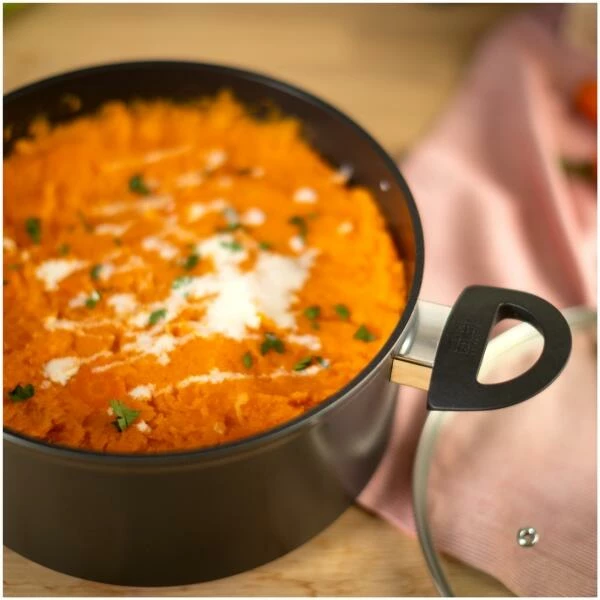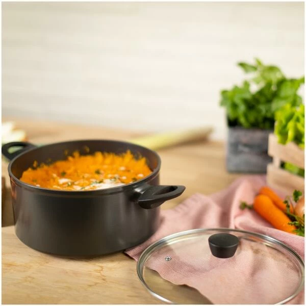 Damit der Koch auch immer weiss, was im Topf passiert, ist das gesamte Kochgeschirr mit einem Glasdeckel augestattet, welches ein Beobachten des Gargutes ermöglicht. Und nicht nur das, der Deckel ist zusätzlich bis zu 180°C backofentauglich. Egal ob Kartoffeln, Gemüse, Pasta, Saucen oder Fleischgerichte – mit diesem Sortiment gelingt einfach alles.