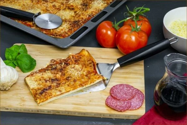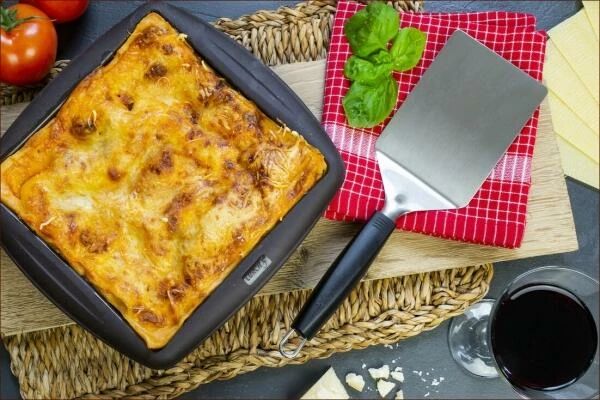 Die vordere Kante der Winkelpalette ist leicht spitz zulaufend. Sie können sie hervorragend als Schneidkante bzw. Trennkante nutzen. So können Sie erst eine duftende Lasagne durchtrennen und im Anschluss aus der Auflaufform heben.