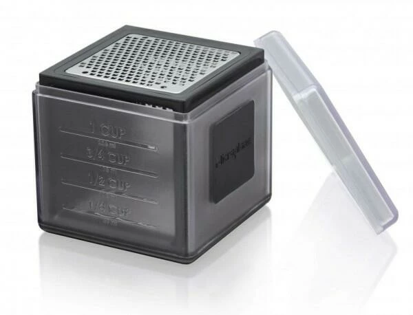 Die Multireibe ist mit drei Klingenausführungen «made in USA» versehen: fein, 2-Wege und grob. So lässt sich von Gemüse, über Käse bis hin zu Schokolade alles reiben. Mit der praktischen Reibe in Würfelform lassen sich die geriebenen Zutaten mit Hilfe des langlebigen, transparenten Covers außerdem auffangen, dosieren und abdecken. Denn das Cover fungiert ebenfalls als Auffangbehälter mit einem Volumen von 350 ml und ist darüber hinaus mit praktischen Maßangaben an drei Seiten ausgestattet. Das kompakte Design der Reibe ermöglicht eine einfache Lagerung. Für zusätzliche Stabilität sorgt die anti-rutsch Basis. Die Multireibe ist sehr leicht zu säubern, da die Reibe spülmaschinengeeignet ist. Das Cover jedoch soll per Hand gespült werden.