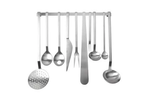 Mono 10+1 ist die Ergänzung zu Mono A. Es besteht aus Schaumlöffel, Salatbesteck, Tranchierbesteck, Wender, Aufschnittgabel, Suppenschöpfer, Saucenlöffel und langem Probierlöffel. 10 Vorlegteile mit angeformtem Haken plus 1 Anhängeleiste.