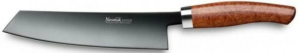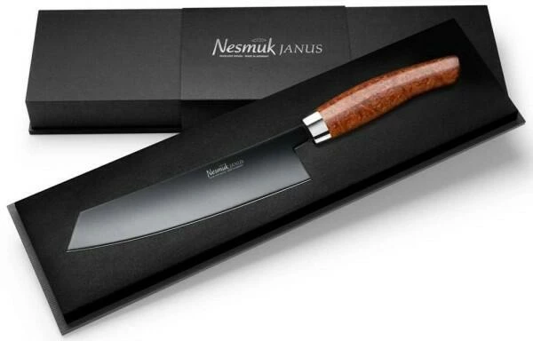 Das Nesmuk Janus Kochmesser verbindet das handwerkliche Können und die langjährigen Erfahrungen von Nesmuk mit modernsten Materialien und Fertigungsmethoden. Eine hochwertige DLC- Beschichtung zeichnet sich durch enorme Härte (2.300 Vickers), niedrige Reibwerte und hohe Haftfestigkeit aus. Die Klinge aus rostbeständigem Hochleistungsstahl mit Niobanteil und Klingenhärte von 60 HRC, der im Klingenstahl trotz Rostfreiheit für ein sehr feines Gefüge sorgt, ermöglicht eine lange Schneidhaltigkeit. Die massive Messerzwinge aus gebürstetem matten Edelstahl und der formschönen Griffe aus Edelholz unterstreichen die handwerkliche Qualität. Geliefert wird das Messer in einer hochwertigen mattschwarzen Schatulle.