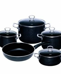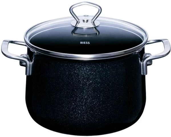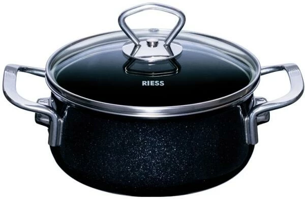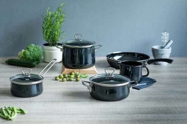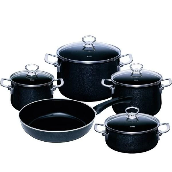 Riess Geschirr-Set aus Emaille, 5-tlg. in black magic. 4 Töpfe und 1 Pfanne aus Emaille, Edelstahl und Glas.