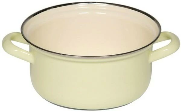 Riess Kasserolle aus Emaille in pastell-gelb. Der kleine halbhohe Kochtopf mit 16 cm Durchmesser ist für alle Herdarten sowie offenes Feuer geeignet. Das besondere Material mit robusten Chromrand ist schnitt- und kratzfest und leicht zu reinigen. Emaille ist von Natur aus bakterienhemmend und aromaneutral.