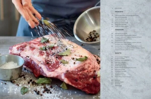 Inhaltlich und optisch für Profis und leidenschaftliche Hobbyköche maßgeschneidert, gliedert sich das neue 360-Seiten-Megawerk zum Top-Thema FLEISCH in zwei Teile. Zunächst die Theorie – profund das Küchenwissen, top-aktuell die Trends, umfassend die Küchenpraxis. Auf Standardwerk-Niveau das Fachwissen zu Fleischqualität, Einkauf, Lagerung, deutsche Schnitte und internationale Cuts, professionelle Vor- und Zubereitungsmethoden: Alles up to date, perfekt in Wort und Bild für die eigene Küchenpraxis aufbereitet. So ist es leicht, sich an den genialen Kreationen der Spitzenköche zu versuchen: Pot-eu-feu mit Lamm-Ossobuco, Wurzelgemüse und Gremolata, Solomillo auf krossem Taco-Gemüse oder ein Tafelspitzsavarin. Gegliedert nach 8 Zubereitungsmethoden von Sous-vide bis Grillen & Smoken sind hier Zeitloses, Experimentelles und Workshops versammelt. Nur eins von vielen Highlights: Das perfekte Steak. Kompromisslos in hochwertiger Ausstattung. Fleisch in Premiumform.