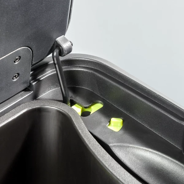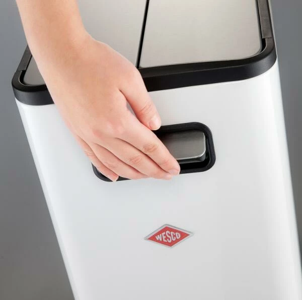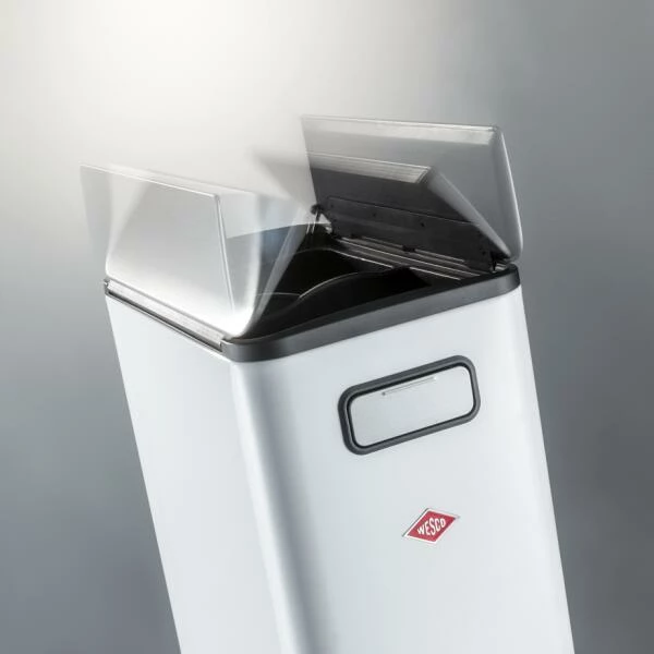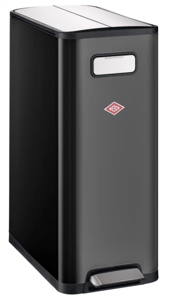 Der Abfalltrenner Big Double Master aus dem Hause Wesco passt dank seiner schmalen Form perfekt in jede Ecke oder Winkel. Die zwei getrennten Kunststoffeinsätze mit je 20 Liter Füllmenge sorgen für die ordnungsgemäße Trennung von Papier, Glas, Kunststoff oder Restmüll. Der Edelstahldeckel ist zweigeteilt und schließt dank eines eingebauten Dämpfers nahezu geräuschlos. Er kann in der offenen Stellung arretiert werden. Eine problemlose Bedienung der Öffnung wird durch den großzügigen Fußtritt aus Edelstahl gewährleistet. Unter dem Behälter befinden sich zwei Rollen, so dass der Abfallsammler mühelos bewegt werden kann.