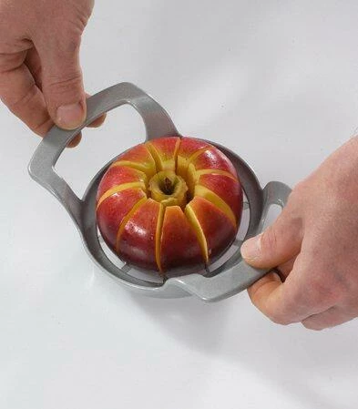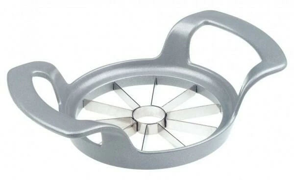 Der hochwertige Ausstecher für Birnen und Äpfel mit speziell geschliffenem Messeraggregat entfernt zum einen das Kerngehäuse der Obstsorten, zum anderen teilt er die Früchte in 10 gleichgroße Stücke. Und das geschieht mit dem Birnen- und Apfelteiler in nur einem Arbeitsschritt. Noch schneller und einfacher geht es nicht.