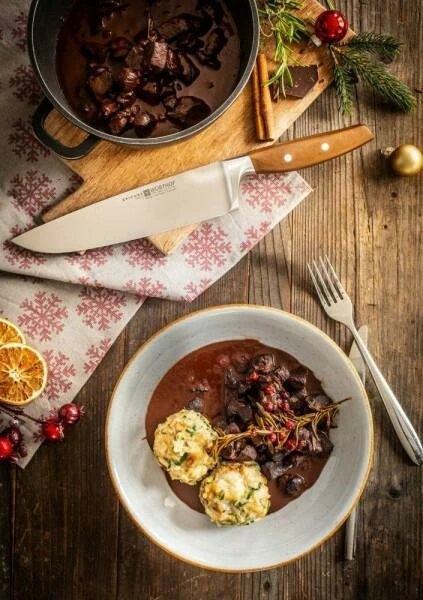 Das Besondere an der Epicure Serie ist das Griffmaterial aus natürlichen Fasern und Harz. Es vereint die angenehme Haptik von Holz mit der Robustheit und den hygienischen Eigenschaften von Kunststoff. Das organische Design des Griffs bietet dabei Anwendern mit kleinen sowie großen Händen perfekten Halt – für agiles und gelenkschonendes Arbeiten. Gleichzeitig ist der neu gestaltete Kropf Ausgangspunkt für eine etwas breiter gestaltete Klingenform. Das bringt mehr Gewicht auf das Schneidgut und vermittelt optimale Kontrolle für präzise und sichere Schnitte.